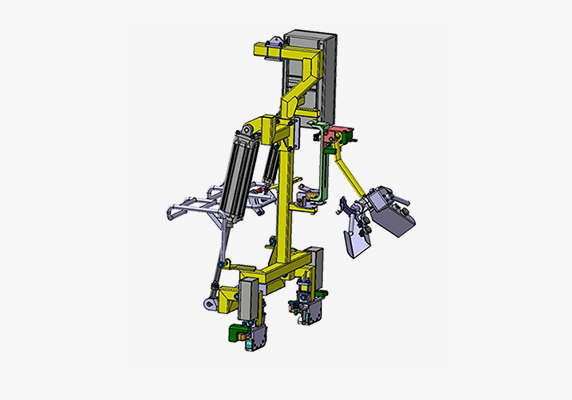 Für die Ablage in einer Montagevorrichtung und im Ladungsträger ist es erforderlich, die Bauteile um 90° nach oben zu schwenken. Aus Sicherheitsaspekten verfügt das Lastaufnahmemittel über einen Sicherheitsbügel, welcher automatisch herunter schwenkt, wenn die Bauteile nach oben geschwenkt wurden. Der Schwenkvorgang und die Bewegung des Sicherungsbügels werden pneumatisch über eine Zweihandbedienung ausgelöst.