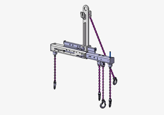 Das Lastaufnahmemittel ist zum Transport und zur Ablage von Pkw-Motoren in der Vormontagevorrichtung beim Kunden vorgesehen. Bei der Konstruktion wurden 18 verschiedene Motorvarianten berücksichtigt. Das Gewicht der Motoren kann maximal 400 kg betragen. Realisiert werden die unterschiedlichen Varianten durch die verschiedenen Anhängepunkte (Ketten) und Stellungen der Traverse.